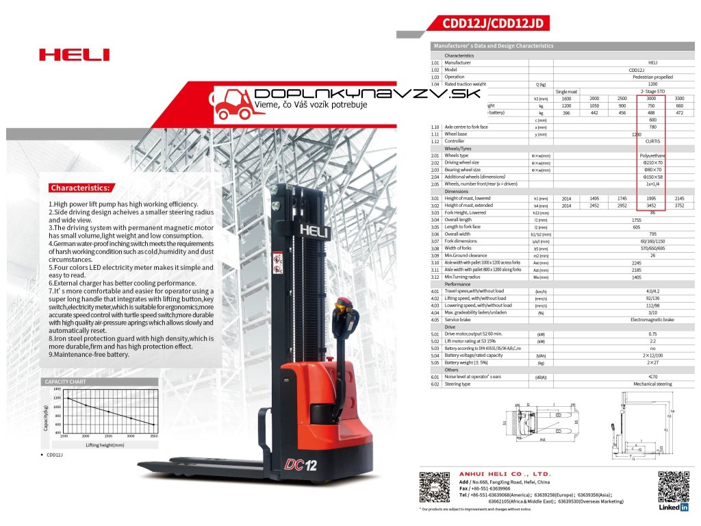 nosnosť 1200 kg zdvih h3 - 3000 mm, prejazdová výška h1 - 1995 mm,max výška veže h4 - 3452 mm